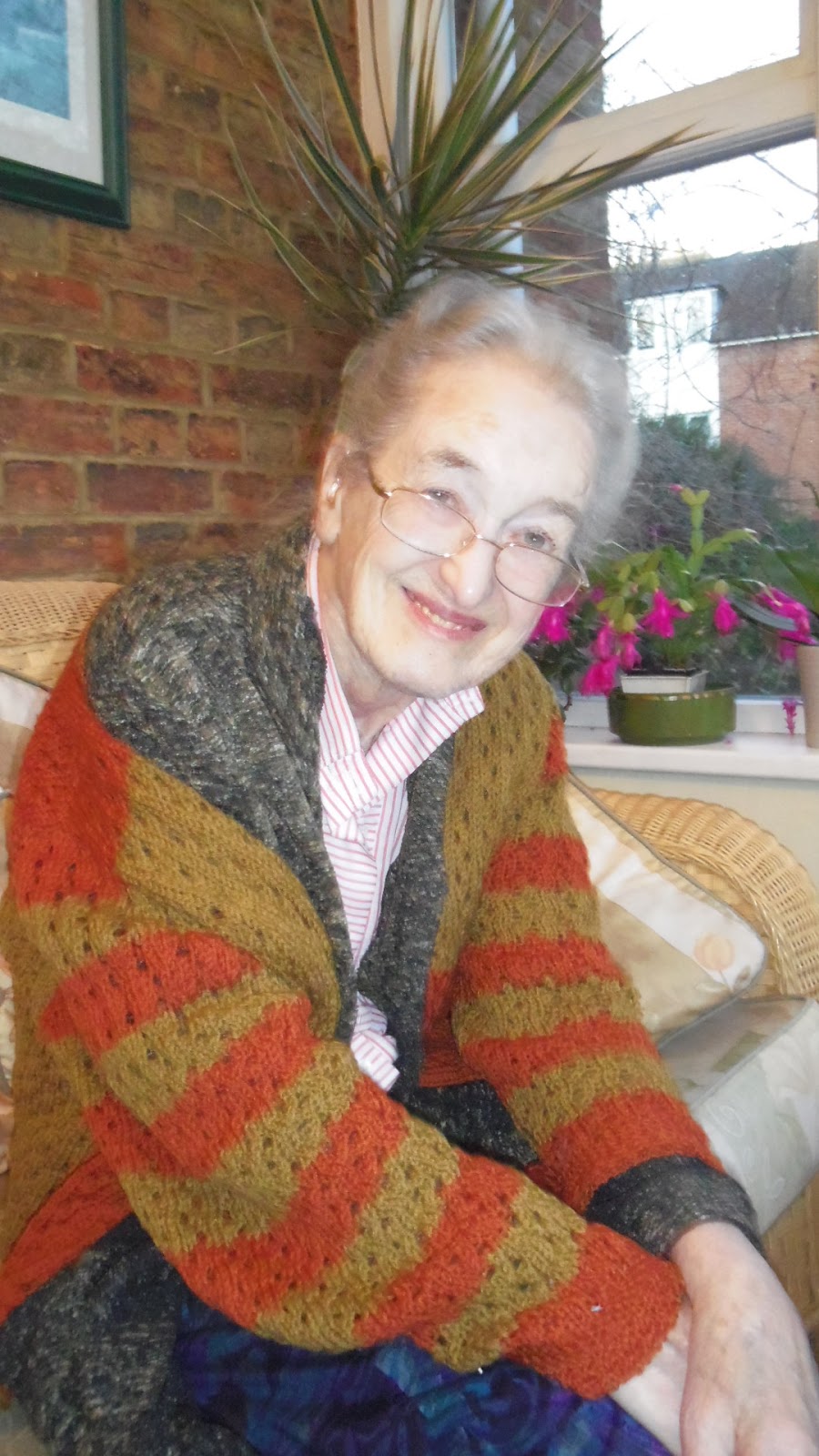 Estis denove granda plezuro reviziti Marjorie Boulton, unu el la plej konataj esperantistoj. Ŝi ĵus festis sian 93-an naskiĝtagon. Plaĉis al mi vidi ŝin en sufiĉe bona stato kaj en bona humoro. "Mi faras bone, laŭ mia aĝo", ŝi volonte konfirmas. Nuntempe ŝi ne plu povas bone marŝi senhelpe, do rulseĝo necesas. Bonŝance kunloĝas kun ŝi Maciej, ŝia prizorganto, kiuj de kelkaj jaroj bonkore kaj ege atente zorgas pri ŝi. Marjorie nomas lin 'mia nobla polo'. Tio ja li estas.